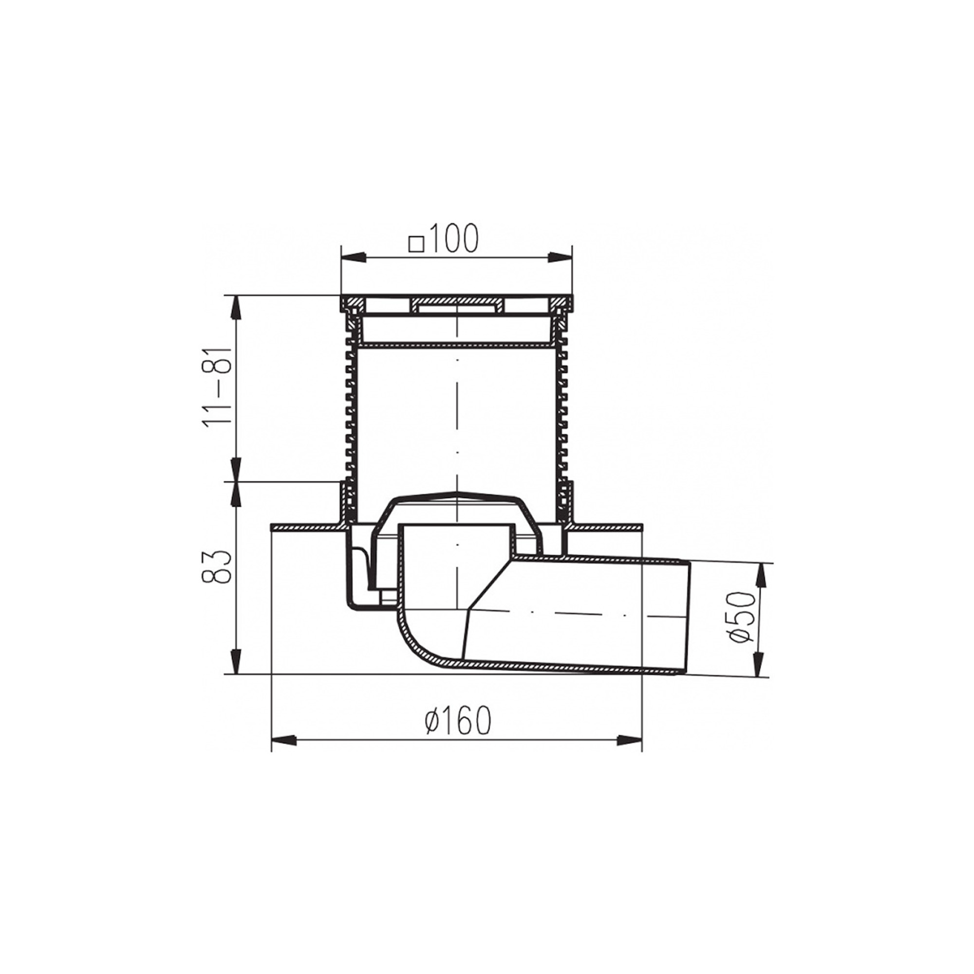 • Výškově nastavitelný nástavec s mřížkou, vodorovný odtok DN 50.